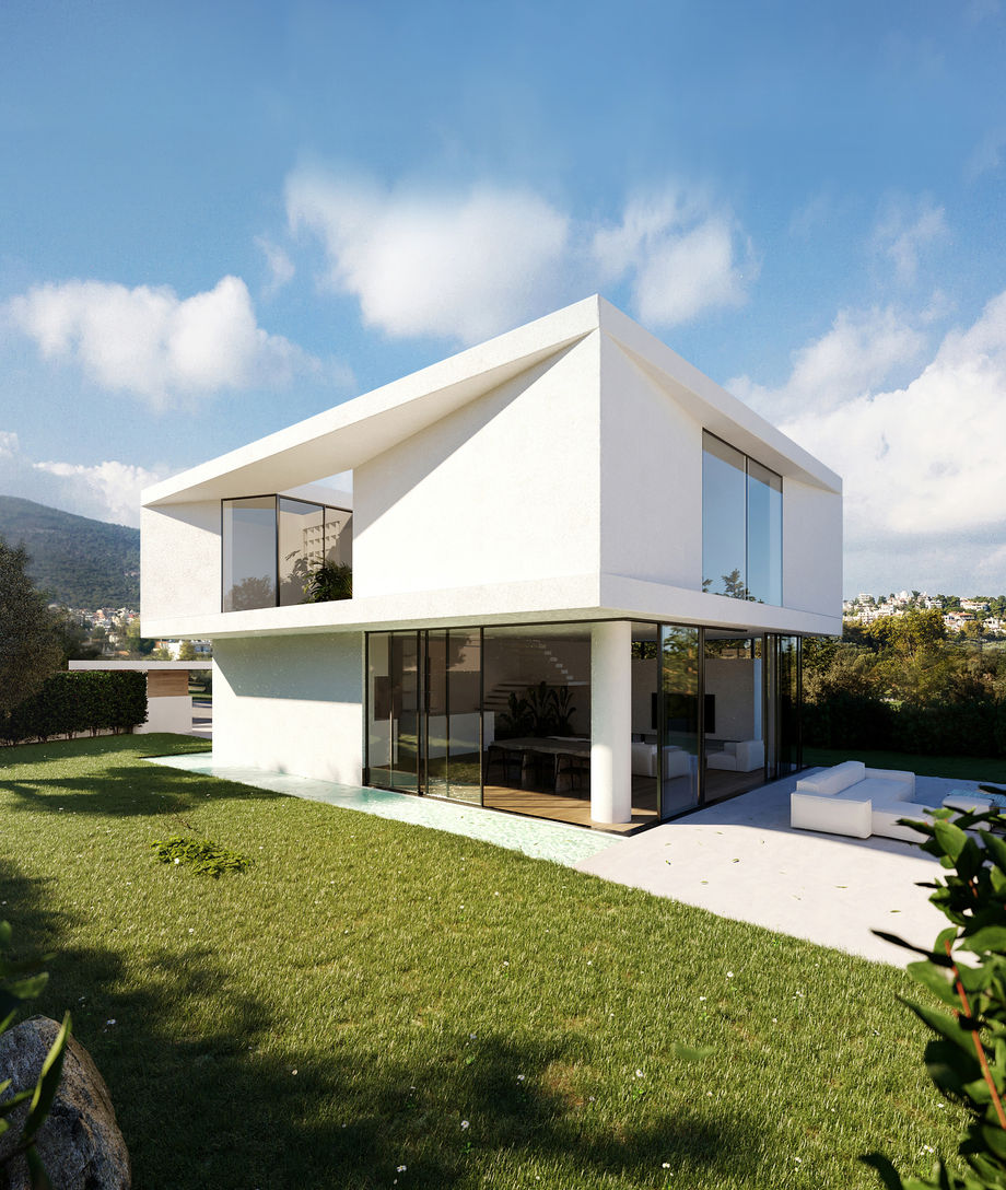 The project consists of twin two-storey residences with prismatic geometries that shape both privacy and perspective. A stone-clad base anchors the complex to the landscape, while the upper plastered volumes reflect the earthy tones of the surroundings. The project consists of twin two-storey residences with prismatic geometries that shape both privacy and perspective. A stone-clad base anchors the complex to the landscape, while the upper plastered volumes reflect the earthy tones of the surroundings.