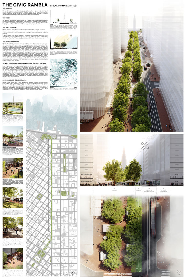 Selected from over 173 entries across 9 countries, The Civic Rambla received an Honorable Mention at the ULI San Francisco Market Street Reimagined competition. The Civic Rambla, reimagines San Francisco's most important street-Market Street as a pedestrian-first civic promenade inspired by Barcelona’s La Rambla. The proposal creates a green, active spine connecting the Embarcadero to Civic Center, anchored by a flexible plaza and a dedicated skate park.